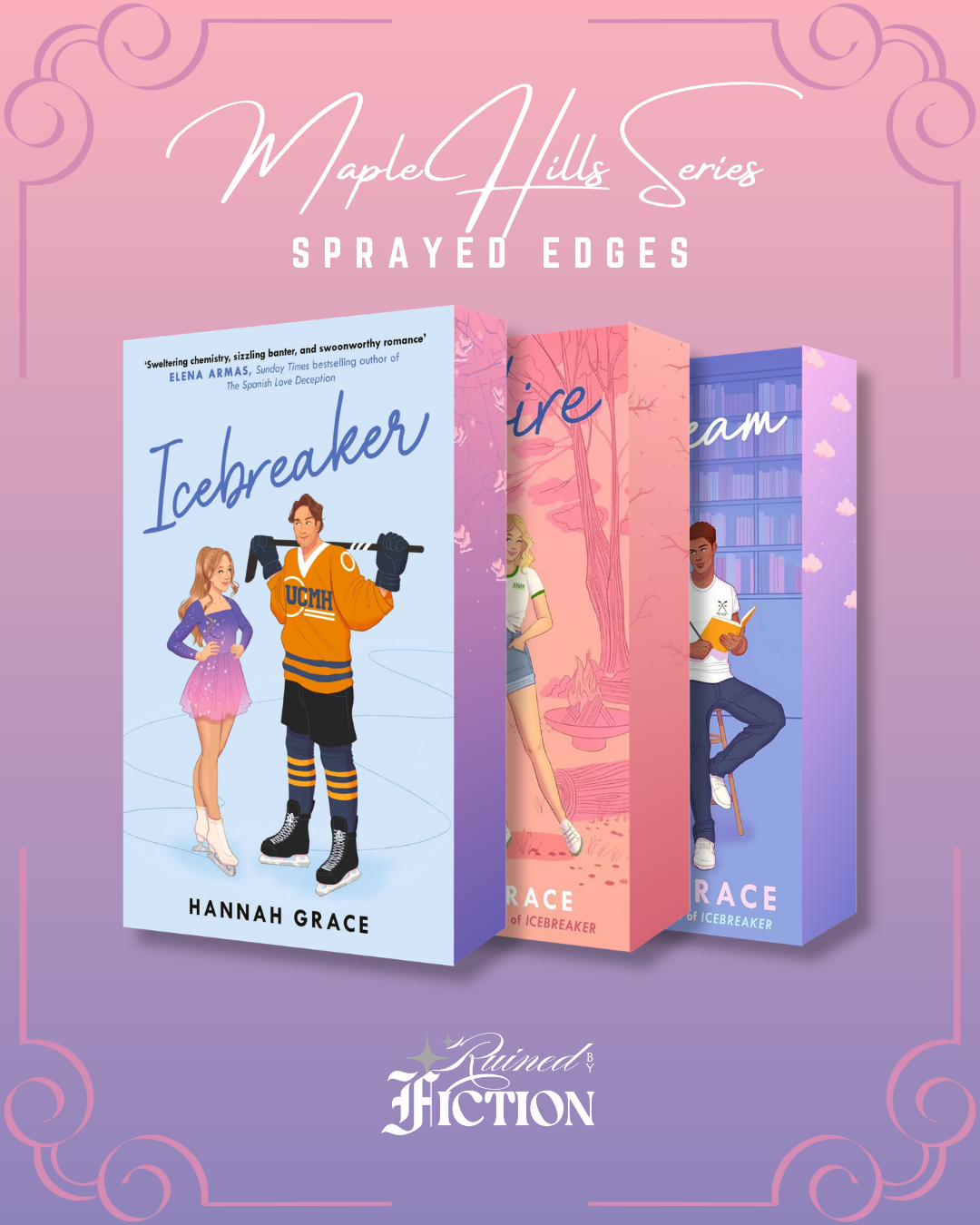 This is a special sprayed edges edition of Maple Hills series by Hannah Grace. Includes the books Icebreaker, Wildfire, Daydream. The book itself remains unaltered from the publisher’s standard edition, with the exception of the custom edge designs.